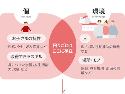 LITALICOジュニアでは、子どもの生きづらさや困りごとは「お子さま」と「環境」の相互作用で生まれるものと考え、この両方へアプローチしています。