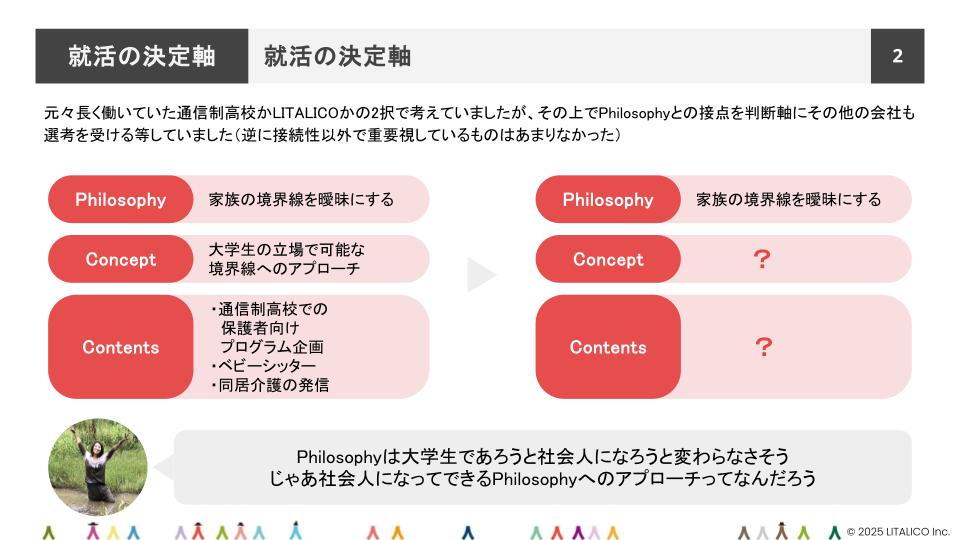 「面接では常に自分の想いを伝え続けながら、親和性がある企業を見ていきました。最終的には、当時アルバイトをしていた通信制高校に就職するか、LITALICOに入社するかで迷いましたが、どの会社を受ける時も、『私は人生でこれを実現したいと考えています。御社ではどういう手段(How)でそれに近づくことができますか?』など、自身の想いとの企業側との接点を探しながら、コミュニケーションを取り続けました。