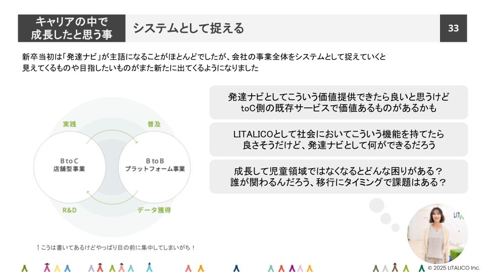 「新卒の頃は『発達ナビ』を主語にして考えていましたが、今は『LITALICO全体』や『社会福祉業界』、あるいは『社会全体』へと、主語を切り替えながら考えるようにしています。