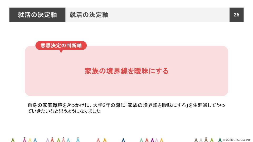そうして定めたのが「家族の境界線を曖昧にする」というフィロソフィーです。以後、学生時代はこのフィロソフィーに基づいていろんな挑戦をしていきました。