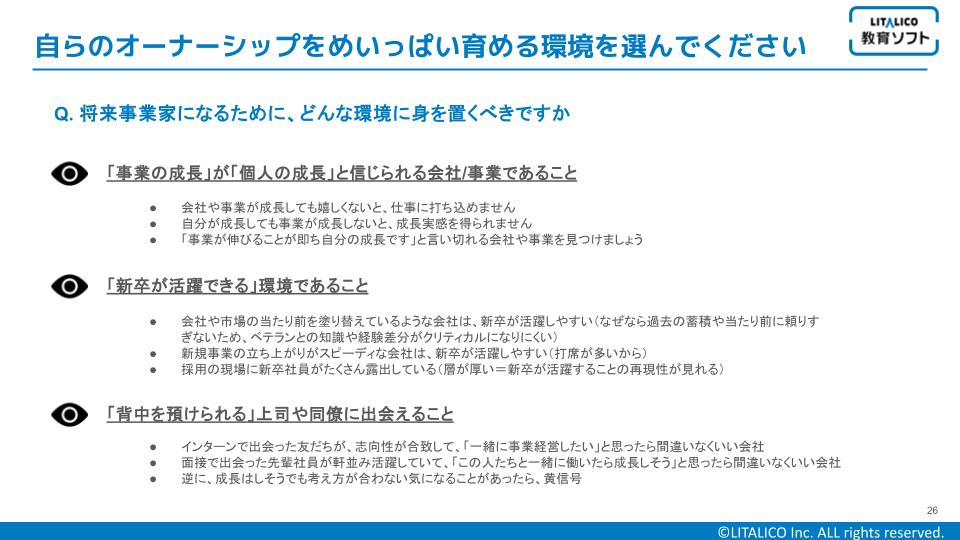 こうした挑戦を続けるためには、環境選びも重要です。「オーナーシップをめいっぱい育める環境を選んでほしい」と前置きした上で、ファーストキャリアを選択する上での3つの軸を伝えました。