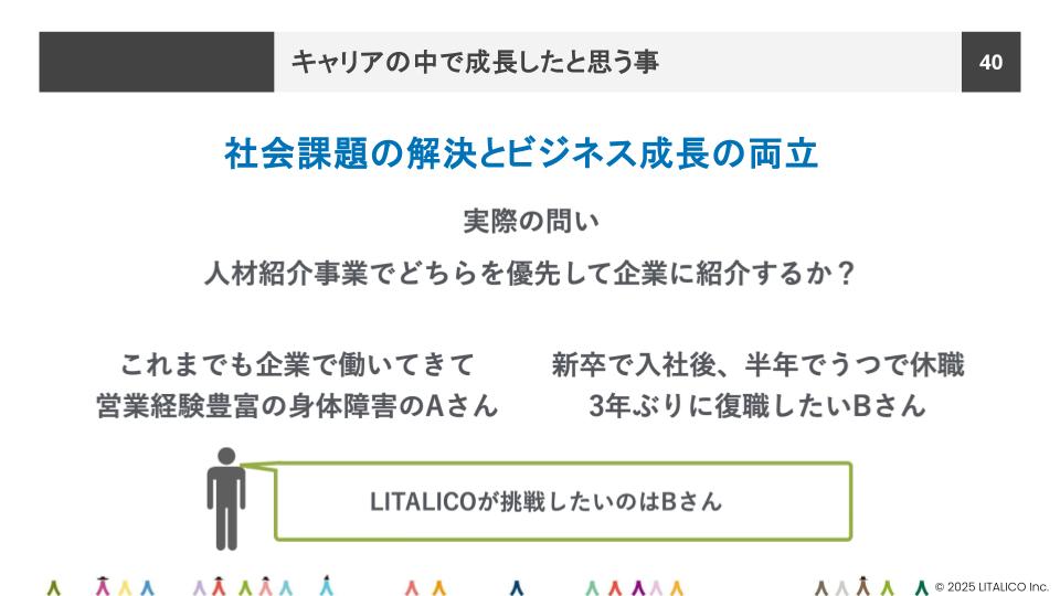 就職活動において、多くの学生が「社会貢献」と「利益追求」のバランスに悩みます。井関は、自身が過去に関わった障害者雇用の人材紹介事業を例に挙げ、LITALICOが向き合っている「問い」について、対照的な二人の求職者の事例をあげて説明をしました。