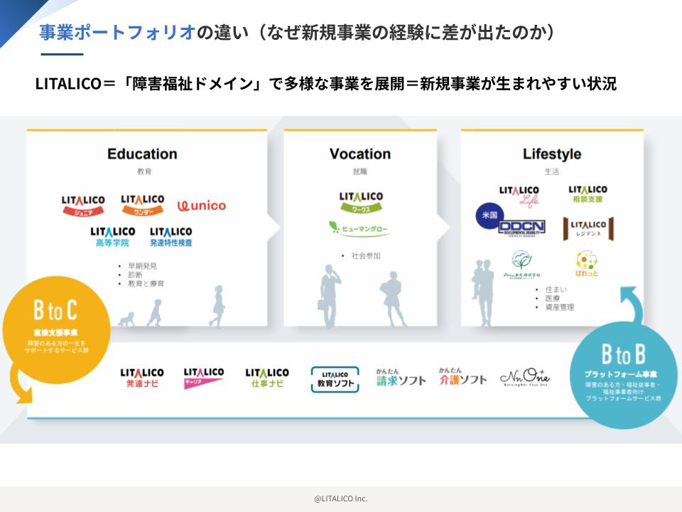「LITALICOは会社として成長するために、常に新しい事業を生み出し続ける必要があります。そのため、若手にも事業開発の機会が多く与えられるのです。若手でも事業の全体を見渡し、戦略を立て、自分たちで意思決定をしながらスピーディーに仮説検証を繰り返していく経験が積める。これが、スキルの違いを生んだ大きな要因だったと考えています」
