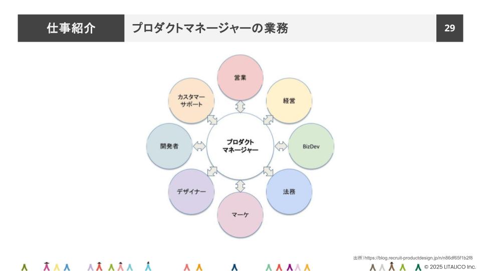 PdMの仕事は、サービスの戦略策定から要件定義、開発ディレクション、リリース後の改善まで多岐にわたります。業務の特徴として、エンジニア・デザイナー・セールス・マーケティング・法務など、関わる職種も非常に多いです。そして、立場によって「見えている課題」が異なるため、全体像を把握しながら、課題解決に取り組むことが求められます。
