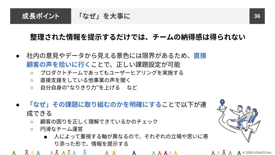 LITALICOに入社してから、PdMとしてスキル面だけでなく、マインド面でも大きな変化がありました。表面的なデータや意見を鵜呑みにせず、その背景にある「なぜ?」を徹底的に掘り下げる姿勢です。