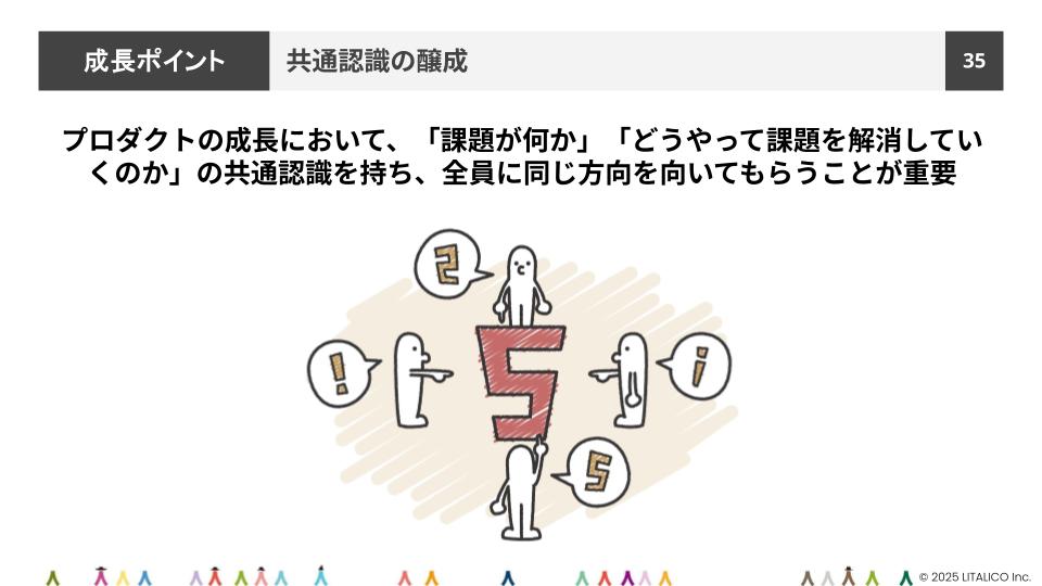 「ある円柱の物体があったとします。それを横から見ている人は『四角形だ』と言い、上から見ている人は『円だ』と言います。どちらも正しいけれど、全体像ではありません。仕事でも同じことが起きるんです。営業は『顧客の数が足りない』と言い、エンジニアは『システムの安定性が重要だ』と言う。それぞれの視点から見える正しさを尊重しつつ、『いま私たちが解決すべき課題はこれだよね』という共通認識(全体像)を描いて合意形成を進めていくことがPdMには求められます。この調整力は、LITALICOに入って最も鍛えられたスキルです」