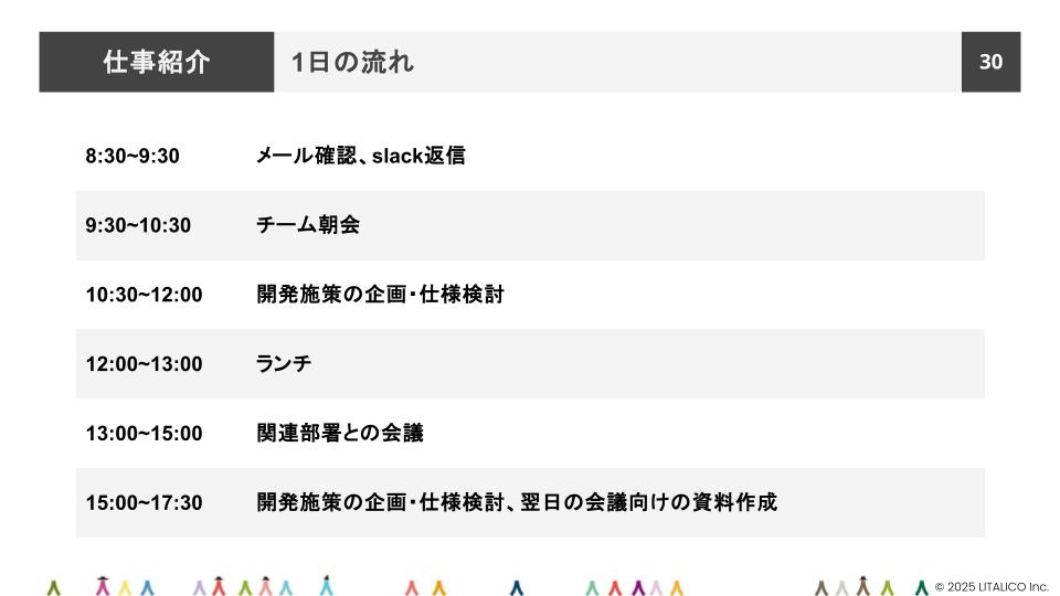 朝はエンジニアチームとの朝会、午後は法務確認や事業部との戦略会議と、次々と異なる職種や立場の人々と対話を重ねています。 そして、最後は会議を経て得られた情報をもとに、開発施策の検討を進めていきます。多様なメンバーと関わりながら、「全体最適の中で何をすべきか」を考えることがPdMという仕事の醍醐味だと語りました。